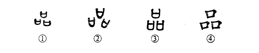 “下品無高門,上品無賤族。”這個“品”字本為會意字。甲骨文①中的“口”表示器物之形,從三“口"表示器物眾多。②是金文的形體。其中一器呈傾斜形。③是小篆的寫法。④為楷書的寫法。自甲骨文至楷書一脈相承。