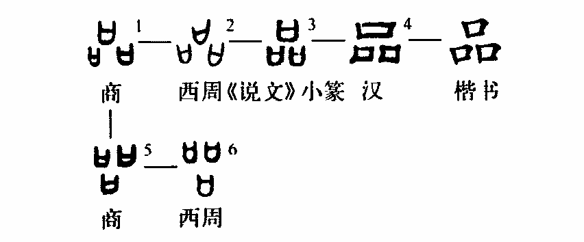會意字。《說文》:“品,眾庶也。”本義是人的多數,以“口”表示人,三“口”表示人的眾多,與“眾”字表示“人”的眾多構字原理相同。邢侯簋:“錫(賜)臣三品:州人、重人、郭人。”這里的“臣三品”就是指居住在州、重、郭的人的共同體。“品”的意義也就相當于現代漢語的“人口”。《易·乾》中“品物流形”中的“品”,已經是“人的多數”這一本義的引申——“眾多”了。在文字結構上,甲骨文與金文都有“品”和“
