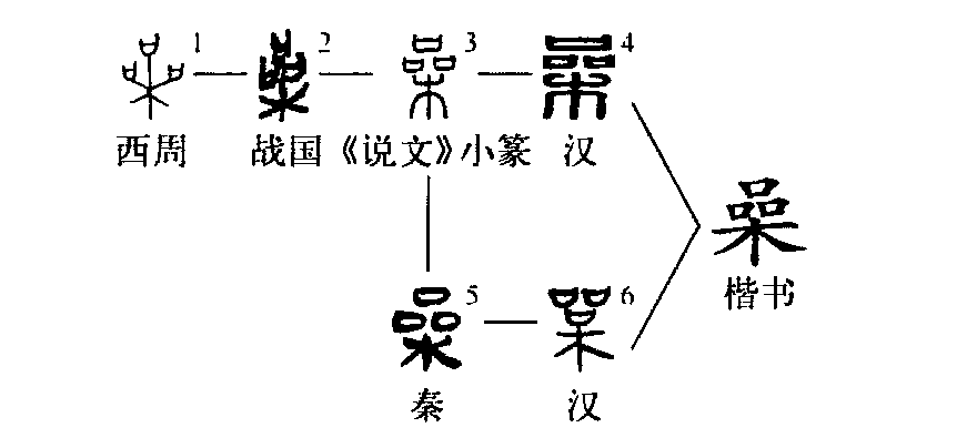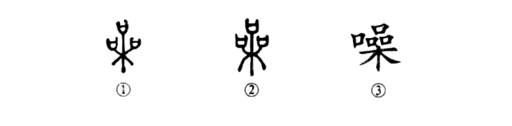 這是“群鴉亂噪”的“噪”字,原為會意字。金文①中有一棵樹,樹上有三個“口”,表示群鳥在枝頭鳴叫。②是小篆的寫法。③為楷書形體,左邊又增加一個“口”,變成了會意兼形聲的字了。