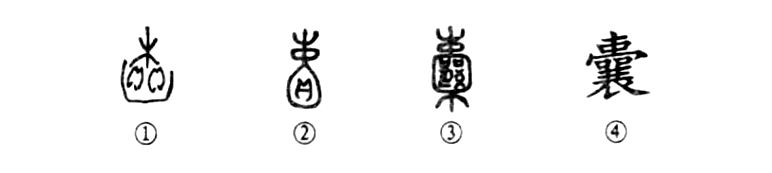 “三十年前共苦辛,囊螢曾寄此煙岑。”這個“囊”字,本為象形字。①是甲骨文的形體,很像一個扎住口的大口袋,口袋里面裝著兩只貝。②是金文的形體,更像一個大口袋,里面裝了一只貝。③是小篆的形體,像上下兩頭都扎住的大口袋,口袋內(nèi)的字通“襄”,表聲。④是楷書的寫法。