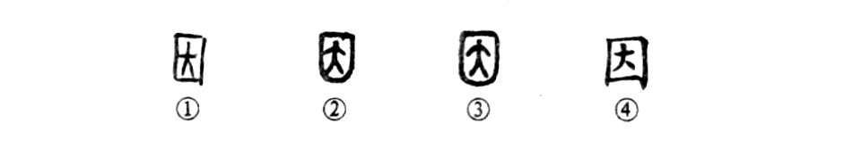 “回風吹四壁.寒鳥相因依。”這個“因”字本為會意字。①是甲骨文的形體,“囗”為“席”的四方形,里面的“大”為人形,象人臥于席上。②是金文的形體,與甲骨文相似。③是小篆的形體。④為楷書的形體。從形體上看,“因”字的古、今文寫法是一脈相承的。