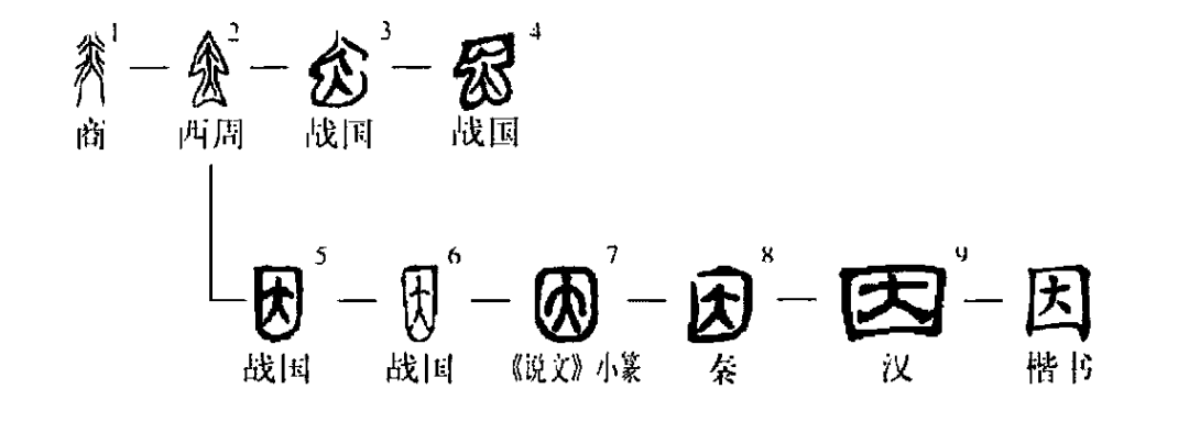 ,乃承襲西周金文;齊系及中山文字(字形6、7)則將隨體詰詘的線條整齊為方形,遂為后世文字所本。“因”,即“裀”之初文,本義指內衣。《字匯?衣部》:“裀,近身衣也。”楚文字“裀”字作