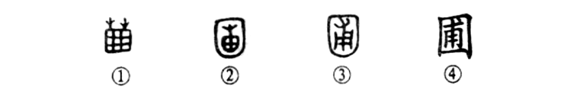 孔子在《論語》中說過:“吾不如老圃。”這是說,我不如種菜的老農。”這個“圃”字,我們從甲骨文①的形體看,其下部是眾多的方框菜田,其上部長出了兩棵菜苗。所以“圃”字的本義是種植蔬菜瓜果的園子。金文②則把甲骨文的形體簡化了一下,并在周圍加了個方框表示圍墻。到了小篆③則把其中的苗圃形偽變為“甫”,這就變成了內聲(甫)外形(囗)的形聲字“圃”了。楷書④則是直接由小篆的形體變來的,也是外形內聲的形聲字。