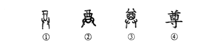 陸游《雜感》:“一尊易致蒲萄酒,萬(wàn)里難逢鸛鵲樓?!痹?shī)中的“尊”字就是一個(gè)會(huì)意字。甲骨文①的下部是一雙手,上部是一個(gè)大酒杯(或酒瓶),是赤誠(chéng)獻(xiàn)酒的意思。金文②與甲骨文的形體比較一致,只是酒器上增添了幾道美麗的花紋。③是小篆的形體,在酒器(酉)之上又增加了兩撇,實(shí)為酒器的蓋子。④是楷書(shū)的寫(xiě)法,其下部由金文和小篆的雙手變?yōu)橐恢皇郑ù纾┝?,是由小篆直接演變而?lái)。