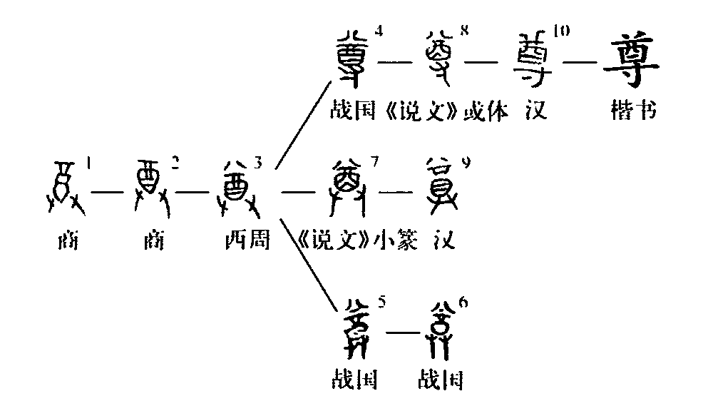 會(huì)意字。甲骨文字形從酉、從廾,后所從之“酉”繁化為“酋”,為《說(shuō)文》小篆所本;戰(zhàn)國(guó)時(shí)期秦文字中又省“廾”為“寸”,為《說(shuō)文》或體與楷書(shū)所宗;另有在“酋”字羨出一畫(huà)者。本義為一種用以盛酒的禮器?!墩f(shuō)文》:“??,酒器也。從酋,廾以奉之。”引申為盛酒祭奠。 《禮記·禮器》:“夫奧者,老婦之祭也,盛于盆,尊于瓶。”孔穎達(dá)疏:“盛食于盆,盛酒于瓶。”引申為尊奉、擁戴。《左傳·成公九年》:“無(wú)私,忠也。尊君,敏也。”引申為重視。《玉篇·寸部》:“尊,重也。”又引申為尊貴、高貴。《廣韻·魂韻》:“尊,貴也。”又虛化為敬詞,用以對(duì)帝王、長(zhǎng)輩及一般人的尊稱(chēng)。(李義海)