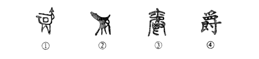 這個“公爵侯爵”的“爵”宇本為象形字。①是甲骨文的形體,就像古代酒器的形狀,下有足,用以溫酒或盛酒,盛行于商代和西周初期。②是金文的形體,更像酒器的形狀,其右邊又增加了一只手。③是小篆的形體,其下部訛變?yōu)閺摹佰耍ü糯漓胗玫囊环N酒),變得相當復雜。④是楷書的寫法。