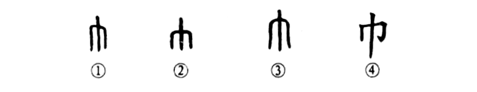 這個“巾”字是個象形字。甲骨文①就像掛下來的一幅布或一條手巾。金文②和小篆③也都基本上同于甲骨文。④是楷書的寫法。