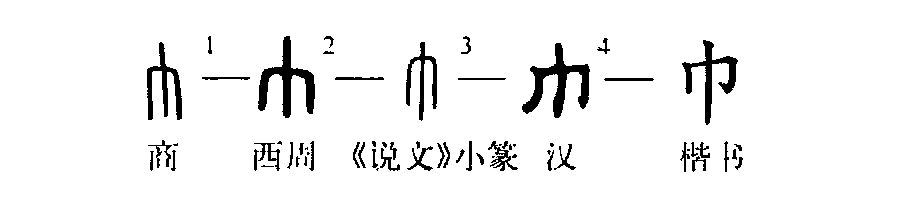 象形字。甲骨文像下垂的佩巾。金文承襲甲骨文。后來, “巾”字中間的一豎漸漸拉長,右邊的“