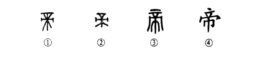 這個“帝王”的“帝”字是個象形字。甲骨文①像橫七豎八的一堆木柴,準備點燃。金文②基本上同于甲骨文。小篆③比甲骨文、金文更復雜,其下部變成了“巾”,所以姑且將“帝”字放在“巾”部。其實“帝”字與“巾”字在詞義上并無聯系,僅是“帝”字的部分形體似“巾”。④是楷書的寫法。