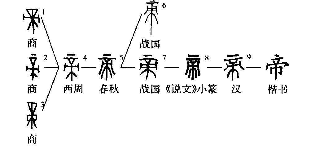 形字。構形不明。有學者認為本像花蒂之形,為“蒂”字初文。《說文》則認為是從上束聲的形聲字。帝字在甲骨文中已出現,多指天帝。《小屯·殷墟文字乙編》6951:“至甲辰帝不其令雨。”(至甲辰這一天,天帝都不會令下雨)亦可指先王,像帝乙、帝辛、文武帝,都是對先王的尊稱,所謂德配彼天。人君生而稱帝,當自晚周時開始,《戰國策·趙策三》:“秦之所以急圍趙者,前與齊湣王爭強為帝。”帝字,甲骨文作“