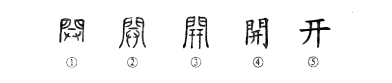 “太白發句,謂之開門見山?!边@個“開”字原為會意字。①是璽文的形體,外部是兩扇大門,內部的“一”是門閂,下面是一雙手,表示用雙手拉開門閂。②是《說文》中的古文形體,與璽文基本相似。③是小篆的形體,內部發生了訛變。④為楷書繁體字。⑤為簡化字。