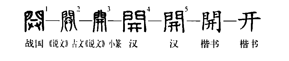 意字。會兩手拉動門栓開門之意?!墩f文》古文開的兩旁為兩扇門,中間一橫為門栓,下面為兩只手,表示用雙手拉動門栓開門。篆文從門,幵聲。楷書繁體作“開”,簡化字作“開”。本義為開門。《玉篇·門部》:“開,張也。”《老子》第二十七章:“善閉,無關楗(鍵)而不可開。”(關鍵:門閂)泛指打開。成語有:開卷有益。引申指開放,即處于打開的狀態。如:眉開眼笑。由打開引申為開辟、擴展,即通過努力使之打開或擴大。如:開荒;開礦。引申為打通、不閉塞。唐李白《望天門山》:“天門中斷楚江開。”引申為抽象意義,啟發、開導,即使思想通達。《荀子·儒效》:“教誨開導成王。”又引申為明達事理。由開辟引申為開始。由打開擴大引申為開闊。轉指性情爽朗。由打開引申為擺開,設置。如:開店;開工廠?,F代又由打開引申出發動、操縱、舉行的意思。如:開車;開會。(胡偉)