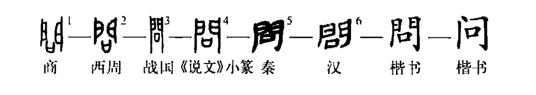 這是“松下問童子”的“問”字。甲骨文①是門內(nèi)有口,表示在門內(nèi)發(fā)問,這是個會意兼形聲的字。②是戰(zhàn)國印文,與甲骨文相同。③是小篆的形體。④是楷書繁體字。⑤為簡化字。
