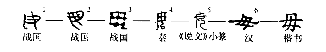 女之分化字。從女,中間加一橫筆為分化符號,女亦聲。女、母、毋均一字之分化。戰國時始分化出“毋”字。楚文字“毋”字或作