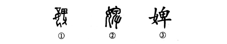 “婢子寒且倦,主人哦不窮。”這個(gè)“婢”字,本為會(huì)意兼形聲的字。①是甲骨文的形體,左邊是“妾”,右邊是“卑”,表示“卑賤的女子”之意。②是小篆的形體,將原甲骨文左邊的“妾”換成了“女”,其義不變。③是楷書(shū)的形體。