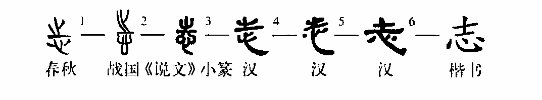 “有志者,事竟成。”這個(gè)“志”字是個(gè)形聲字。①是古璽文的形體,上部是“之”,表聲;下部是“心”,表形。②是小篆的形體,與璽文形體極相似。③是楷書(shū)的寫(xiě)法。