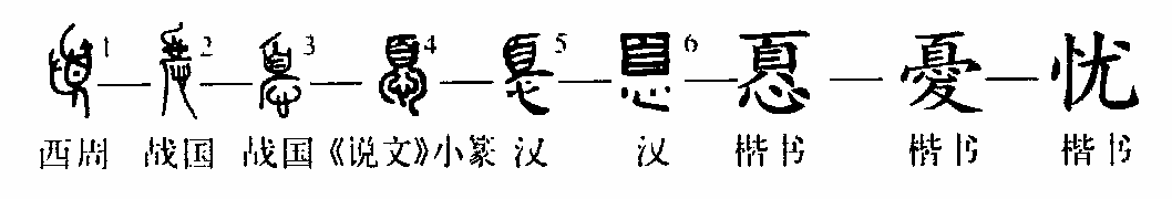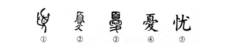 “人無(wú)遠(yuǎn)慮,必有近憂。”這個(gè)憂字本為象形字。①是金文的形體,是一個(gè)面朝左而站立的人,舉手搔頭,表示憂愁。②是古璽文的形體。上部為“頁(yè)(頭)”,中間是“心”,下部有“夂(腳)”,仍表示人的憂愁之意。③是小篆的寫法。④為楷書繁體字。⑤為簡(jiǎn)化字。
