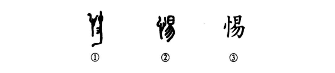 這個(gè)“提高警惕”的“惕”字,是一個(gè)會(huì)意兼形聲的字。金文①的左邊是個(gè)“心”,右邊是“易”字,像“蜥蜴”(四腳蛇)之形,上部是頭,下部有腿有尾。說它是會(huì)意字,是認(rèn)為四腳蛇要咬人,所以要當(dāng)心!有“心”字表示提高警惕;說它是形聲字,因?yàn)槭亲笮危ㄐ模┯衣暎ㄒ祝"谑切∽男误w,是由金文直接演變而來。③是楷書的寫法,是由小篆直接演變而來。