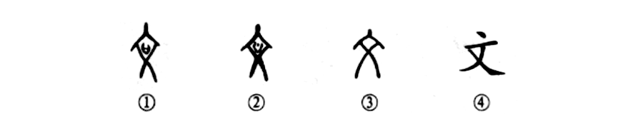 這個“文”字是個象形字。像什么呢?像一個心寬體胖的壯年人。你看甲骨文①就像正立的人形。最上端是頭,向左右伸展的是兩臂,下部是兩腿,胸前刻有美觀的花紋。金文②的形體基本上同于甲骨文,胸前的花紋更好看了。小篆③則把胸前的花紋省略了。④是楷書的形體,一點也看不出“人”形了。