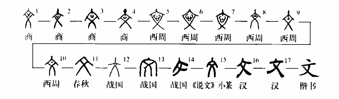 ,即刻畫之文飾也。 《禮記·王制》:‘東方曰夷,被發文身,有不火食矣。’孔疏:‘文身者,謂以丹青文飾其身。’ 《谷梁傳·哀公十三年》:‘吳,夷狄之國也,祝發文身。’范注:‘文身,刻畫其身以為文也。’考文身為初民普遍之習俗。”于省吾主編《甲骨文字詁林》“文”字條后姚孝遂按:“朱芳圃以‘文’之本義為‘文身’之文,其說可信。”據上諸說,則“文”字本作