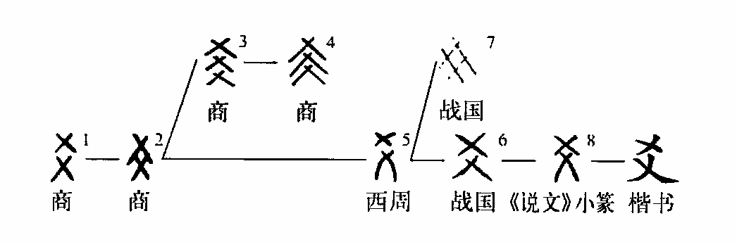 象形字。商代甲骨文凡四筆,每兩筆作一交織叉狀,然后兩叉上下重疊,象交叉、交錯、交會之形。繁體則為六筆,作三叉重疊,然未取得主流地位。戰國時或將重疊的兩叉整合作井形的