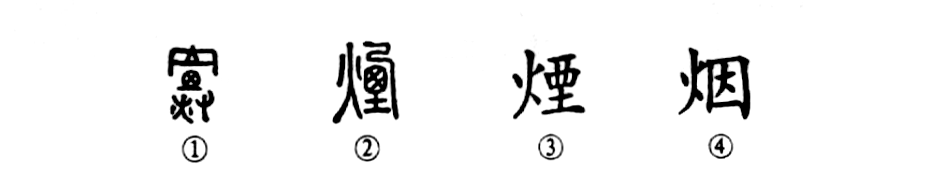 “日照香爐生紫煙,遙看瀑布掛前川。”這個“煙”字本為會意字。古璽文①的上部為“窗”,左下角為“火”,右下角為“手”,表示手執火而燃燒,煙自窗出。②是小篆的形體,變成了“從火,垔聲”的形聲字了。③是楷書異體字的寫法,現已廢除。④為保留使用的“煙”字,也是形聲字,但其筆畫較少,書寫方便。