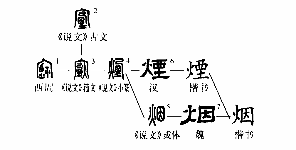 ,籀文從宀。”《韓非子·喻老》:“千丈之堤,以螻蟻之穴潰;百尺之室,以突隙之煙焚。”《周禮·秋官·蟈氏》:“以其煙被之,則凡水蟲無聲。”泛指煙狀物質,如云、霧等。由燃燒時產生的氣體引申指煙熏所積的黑灰,即煤炱。特指某些能產生煙的東西,如煙草、煙草制品、鴉片等。金文從宀、從火、禋省聲;籀文構形與金文略近,從宀、從火、垔聲,《說文》古文省去“火”;小篆成左右結構,左“火”、右“垔”,或體作左“火”、右“因”;隸楷文字由小篆演變而來。按,“垔”下的“土”本或為“火”之訛。由此推測,“垔”應即“煙”之會意本字,從火燒樹葉形會煙氣之意。“煙”由“垔”重加“火”旁而來。“煙”中的聲符“因”則可能是樹葉形的聲符化變體。現代漢字整理時,“煙”作為“煙”的異體字被淘汰。(郭小武葉青)