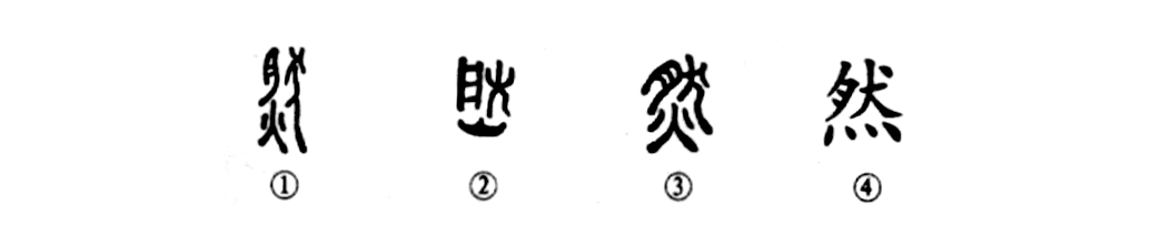 這是“燃燒”之“燃”的本字“然”,原為會意字。①是金文的形體,左上角是“肉”,右上部為“犬”,下部為“火”,表示以火燒犬肉。②也是金文的形體,其下部更像火苗上冒的形狀。③為小篆的形體。④為楷書的寫法。