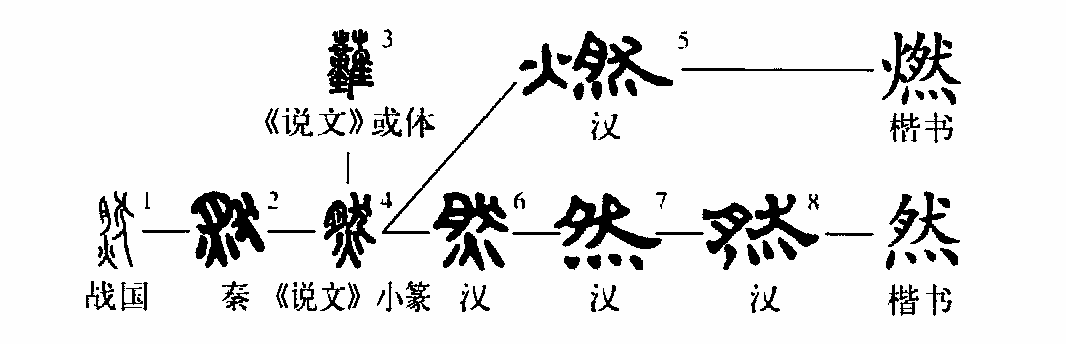 ,為從火、難聲或?聲的形聲字。“然”字本義是燃燒。《說文》:“然,燒也。”徐鉉注:“然,今俗別作燃。”《孟子·公孫丑上》:“凡有四端(仁、義、禮、智四種開端)于我者,知皆擴而充之矣,若火之始然,泉之始達。”“然”字因借用作代詞、嘆詞、副詞、連詞、助詞等,本義反被掩蓋了,為便于區別,人們又在“然”下增加形符“火”,造了個從火、從然、然亦聲的會意兼形聲字“燃”。從此,“燃”專職指燃燒,“然”則用于各種假借義。戰國文字左上為“肉”的古字形,左下為“火”,右為頭朝左的直立犬形;小篆結構略有變化,上左為肉形、右為“犬”,下為“火”。就構形取意而言,有一種直觀通俗的理解,認為以“火”燒“犬”之“肉”即為“然”(燃)。后來為了形體結構平整,位于下部的火形演變成“灬”。(郭小武 葉青)
