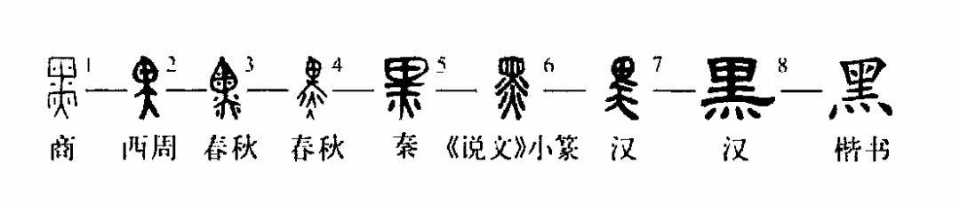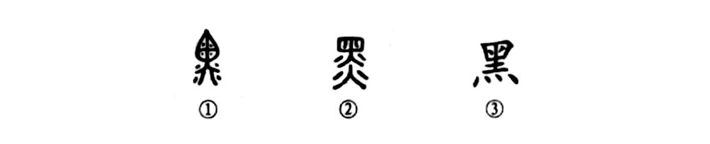 “滿面灰塵煙火色,兩鬢蒼蒼十指黑。”這個(gè)“黑”字是個(gè)會意字。金文①的上部表示像煙囪形,當(dāng)中的黑點(diǎn)兒是表示煙囪里面的黑灰,下部是個(gè)“炎”字。這就是說,在燒火時(shí),把煙囪里面都熏黑了。②是小篆的形體,與金文的形體基本相似。③是楷書的寫法,把小篆的“火”變成了四個(gè)點(diǎn)兒了。在漢字中,凡是有“四點(diǎn)底”的字大都是“火”字變來的,這是為了結(jié)構(gòu)美觀,書寫方便。