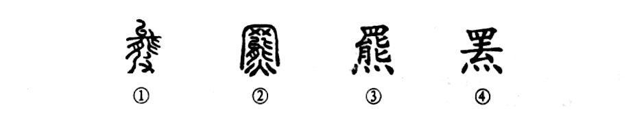 “獨有英雄驅虎豹,更無豪杰怕熊羆?!边@個“羆”字本為形聲字。①是《說文》中古文的形體,其上部的“能”是“熊”的象形字;下部是“皮”,表聲。可見“羆”本是“從能,皮聲”的形聲字。②是小篆的形體,“熊”上增“網”。許慎說:“從熊,罷省聲。”又成為一個新的形聲字了。③是楷書繁體字。④為簡化字。