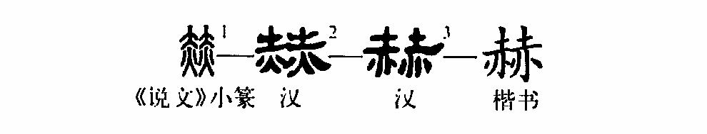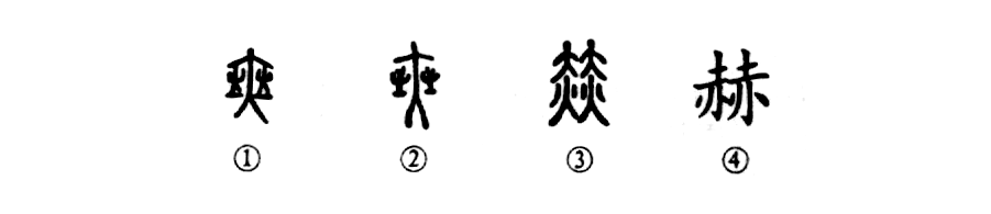 (赫)”字,中間為“人”形,兩側有“火”,照得人身火紅。②是金文的形體,與甲骨文相似。③是小篆的寫法。④為楷書的寫法。