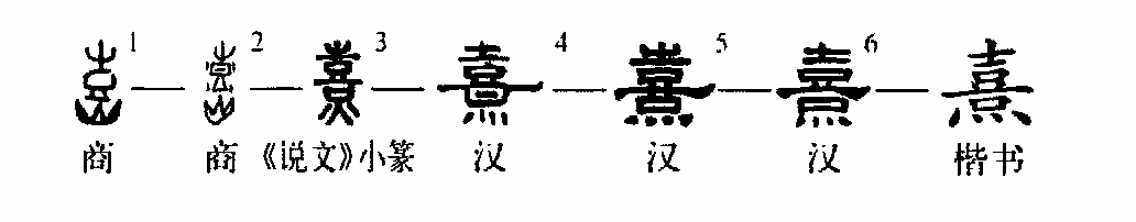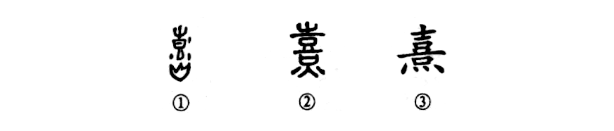 這個“熹”字是會意兼形聲的字。①是甲骨文的形體,上部為“鼓”形,下部是“火”,上古制好鼓之后,要用微火烤干其蒙皮,所以“熹”為“烤”義。②是小篆的形體,字形較繁,但意思未變。③是楷書的寫法。