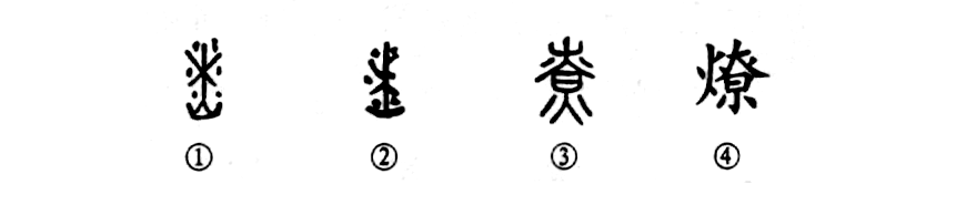 這是“星火燎原”的“燎”字,是個象形字。甲骨文①的下部是“火”,上部是“木”,“木”字上面的小點表示火焰。②是金文形體,類似于甲骨文。③是小篆的寫法,其上部的“木”已經(jīng)發(fā)生了訛變,下部的“火”依然在。④是楷書的寫法。因為下面的“火”訛變?yōu)椤靶 保栽谄渥筮呌衷黾右粋€“火”旁,表示“燎”與“火”有關(guān)。