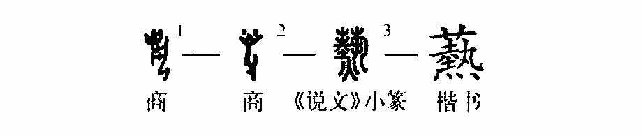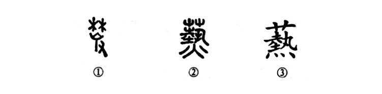 這個“爇”字讀作ruò,又讀rè。甲骨文①是手拿火炬焚燒草木的樣子,可見這是個象形字。②是小篆的寫法,反而繁化了,變成上聲下形(火)的形聲字了。③是楷書的寫法,直接由小篆演變而來。