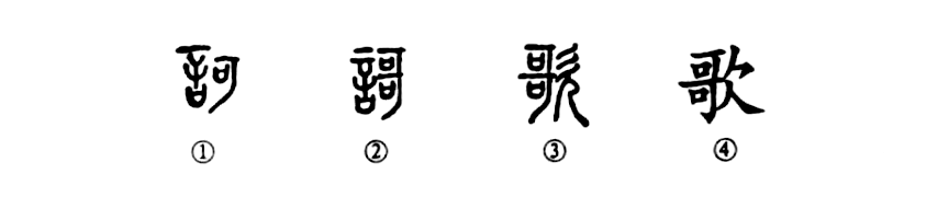 “流風(fēng)入座飄歌扇,瀑布侵階濺舞衣。”這個“歌”字本為形聲字。①是金文的形體,左邊是“言”,右邊是“可”,是“從言,可聲”的形聲字。②是小篆的異體字。③是小篆的通行體。將“言”換成“欠”,義相近,都與“人”有關(guān)。④為楷書的形體。