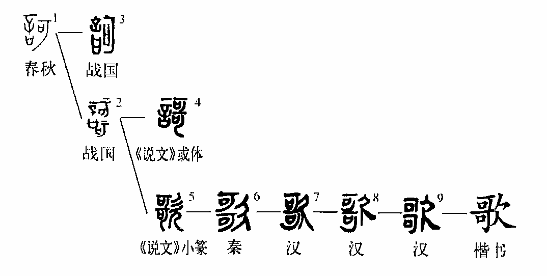 形聲字。 《說文》:“歌,也。從欠,哥聲。謌,謌或從言。”段玉裁注:“可部曰:哥,聲也,古文以為謌字。”《詩·魏風(fēng)·園有桃》:“心之憂矣,我歌且謠。”毛傳:“曲合樂曰歌,徒歌曰謠。”《大雅·行葦》:“或歌或咢。”《小雅·四牡》:“是用作歌,將母來諗。” 《大雅·桑柔》:“既作爾歌。”歌字常見于西周文獻(xiàn),但古文字資料中最早見于春秋時代。戰(zhàn)國古文字中歌字有從口哥聲者,也有從言可聲者,《說文》小篆之或體從言哥聲即承襲戰(zhàn)國古文字訶字的形體。從欠之歌,見于《說文》小篆,更習(xí)見于秦簡、漢簡帛,其形體當(dāng)產(chǎn)生于春秋戰(zhàn)國時代的秦國。春秋時代的“訶”正用為歌曲之歌。(周寶宏)