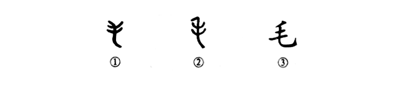 這是“毛”字。從金文①的形體看,就像彎彎曲曲的毛發之形。小篆②的形體也基本上同于金文。③是楷書的寫法,是由小篆的形體直接演變而來。