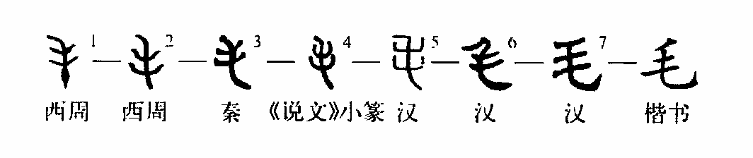 如毛,民鮮克舉之。”可見獸毛之義當是毛字的初義和常見義。《說文》小篆毛字形體是直接承襲西周金文、秦代毛字形體而來。漢代初年馬王堆漢墓帛書的毛字形體是從篆文向東漢時代成熟隸書以及后代楷書毛字形體的過渡形式。(周寶宏)
