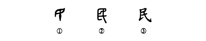這個“民”字是個象形字。金文①的上部是一個眼睛,其下是一把錐子刺進了眼睛。這表明在奴隸制社會里,奴隸主用極其殘酷的手段把奴隸的一只眼睛刺瞎,并強迫他們勞動。小篆②形體大變,完全看不出錐子刺眼的形象了。③是楷書的寫法,是由小篆直接演變而來。