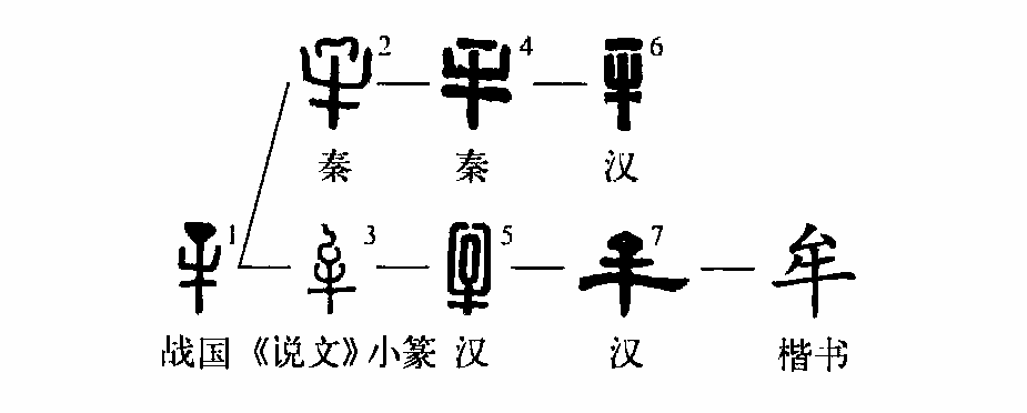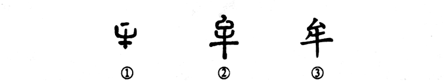 這個(gè)“牟”字讀作móu,原為象形字。①為金文的形體。牛頭上的一橫畫表示牛叫時(shí)所發(fā)出的聲氣。②是小篆的寫法,牛頭之上的一橫畫變?yōu)椤佰獭保囆g(shù)化了。③是楷書的寫法。