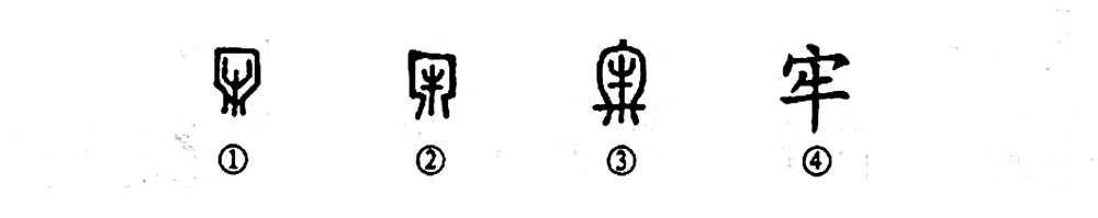 這個“亡羊而補牢”的“牢”字是個會意字。甲骨文①的外面像飼養牲畜的欄圈,其中間是“牛”,也就是把“牛”關在欄中之義。金文②的形體與甲骨文的形體基本一致。③是小篆的寫法,把牛關在欄中,在欄門上再橫上一塊大木頭,牛跑不出來,可謂牢固了。④是楷書的寫法,從“宀”從“牛”當然仍是一個會意字。