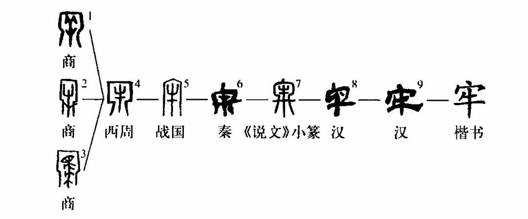 像圈欄之形。 《說文》小篆因秦簡寫法而誤增一筆,許慎遂以為從冬省,非是。睡虎地秦簡是處于隸變中的文字,它包含有篆體和隸體兩重因素,即篆、隸合一,李斯所制小篆即源于其篆體因素。睡簡和小篆時代相近,《漢語大字典》排列字形依時代先后均把睡簡文字置于《說文》小篆后,但從實際的文字形體演變角度考慮,不能如此拘泥,應依從文字形體發展的實際脈絡,或置于小篆后,或置于小篆前。本條置于小篆前,所謂從冬省便可做出一個合理的解釋。“牢”字本義指養牛、羊、馬等牲畜的圈欄。《說文》:“牢,閑,養牛馬圈也。”《詩·大雅·公劉》:“執豕于牢。”然甲骨文中不用本義,而是用其引申義,指關養于圈欄中之牛羊馬。古代祭祀,對于圈養之牛與非圈養之牛區分甚嚴。據卜辭所反映的情況,殷人稱普通的牛為“牛”,它們可能是普通牧放中的牛,也可能是臨時征收來的。而牢是經過特殊飼養的牛,作為祭牲,用“牢”要比用“牛”隆重。這種經過特殊飼養的牛,其大者謂之“大牢”,其小者謂之“小牢”,傳世文獻中稱牛羊豕各一為大牢,羊豕各一為少牢,原是秦漢以來的一種說法,并不符合殷商禮制。甲骨文中字或從羊作,亦或從馬,構意與牢同,其構形可與甲骨文之“牡”、“牝”等相參。由牢閑義引申出牢獄義。牢用來關養牲畜,為防止其逃跑,要修得牢固,因此又引申出牢固義。(陳英杰)