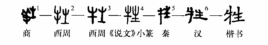 形聲字。從牛,生聲。本義指供祭祀用之全牛。《字匯·牛部》:“牲,祭天地宗廟之牛完全曰牲。”《谷梁傳·哀公元年》:“全曰牲,傷曰牛,未牲曰牛。其牛一也,其所以為牛者異。”引申泛指供祭祀及食用的家畜,包括牛、羊、豕、馬、犬、雞等。西周金文矢令方彝:“明公用牲于京官。”《周禮·天官·膳夫》:“凡王之饋,食用六谷,膳用六牲。”鄭玄注:“六牲,馬、牛、羊、豕、犬、雞也。”今日所說“牲口”、“牲畜”等還保留其引申義,但表祭祀用之義素則已消失。用于舍棄義的“犧牲”已與本義遠隔。甲骨文中有一字作