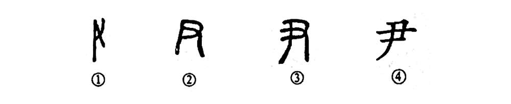 這個“尹”字讀作yǐn,本是會意字。①是甲骨文,一豎是一枝筆的形象,右邊是一只手,是史官執筆辦事之意。②是金文的寫法。③是小篆的形體。④是楷書的形體。都是從甲骨文演變而來的,并無多大變化。