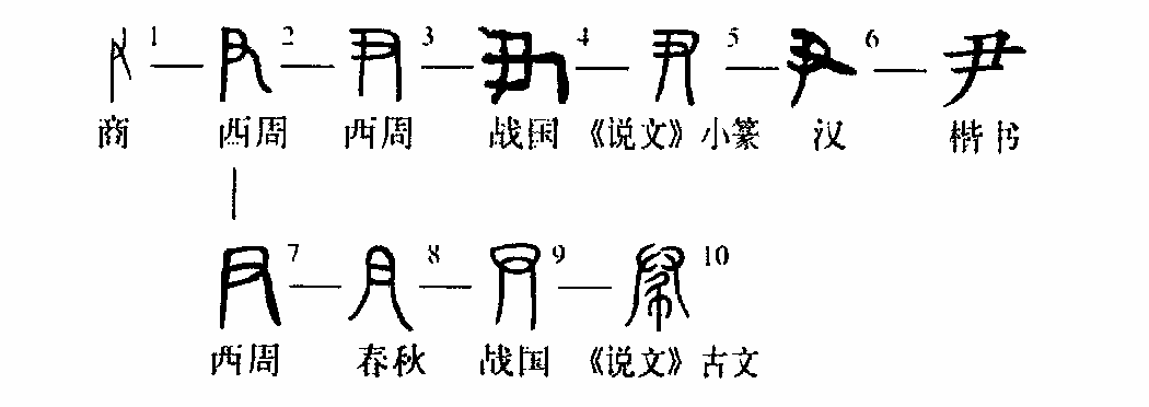 會意字。像以手持物形。所持物多以為是筆形,即古之“聿”。“尹”是以用手持筆會治事之義。《說文》:“尹,治也。從又、丿,握事者也。”現在人們對“尹”字的認識其實并沒有超越許慎多少。說所持像筆,也純屬猜測。“尹”在文獻中最常用的詞義是治事之職官。“治”與“治者”是動、名相因,不必指定哪個是本義,凡與文字構形有直接聯系的意義都可視為本義。“尹”字發展到春秋,為了追求字形的對稱美觀,左右兩側圓轉對稱,已看不出以手持物的樣子了。《說文》古文所從的“尹”更分裂為左右對稱的兩只手,其訛變的過程與“君”字古文所從“尹”完全相同。(李守奎)
