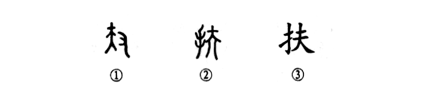 這是“抑強扶弱”的“扶”字。金文①的左邊是“夫”(“夫”就是“人”),有兩臂兩腿,最上部的一條橫線是頭上橫插的簪子,右下方是一只大手,表示用手扶人走路之意。②是小篆的形體,“夫”移到“手”的右邊了,而且也不太像“人”的形象。③是楷書的寫法,它由小篆演變而成。可見“扶”字是一個會意字,若把它理解為“”形“夫”聲的形聲字那就錯了。