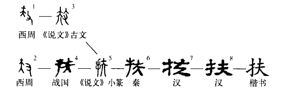 像手持半個竹。小篆上承戰(zhàn)國形體,“夫”移到“手”的右邊,而且也不太像“人”的形象。隸書、楷書的寫法由小篆演變而成。《說文》:“扶,左也。從手,夫聲。”段玉裁注:“‘左’下曰:手相助也。”所釋為引申義。本義是攙扶,扶持。《論語·季氏》:“危而不持,顛而不扶。”引申為幫助,支持。《戰(zhàn)國策·宋衛(wèi)策》:“若扶梁伐趙,以害趙國,則寡人不忍也。”高誘注:“扶,助也。”由扶持義,又引申為護(hù)送。唐杜甫《別蔡十四著作》:“主人薨城府,扶櫬歸咸秦。”對被攙扶的人來說,就是有了依靠,故又引申為拄著,持著。漢賈山《至言》:“臣聞山東吏布詔令,民雖老羸癃疾,扶杖而往聽之。”又虛化為介詞,表示方向,意為沿著、順著。晉陶潛《桃花源記》:“既出,得其船,便扶向路,處處志之。”(荊亞玲蔣曉薇)