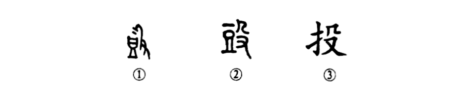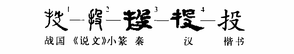 這是“投筆從戎”的“投”字,是個會意字。甲骨文①的左邊是“豆”,右邊是“殳”,表示“敲擊”義。②是小篆的形體,由甲骨文直接演變而來。③是楷書的寫法,將“豆”換成提手旁。