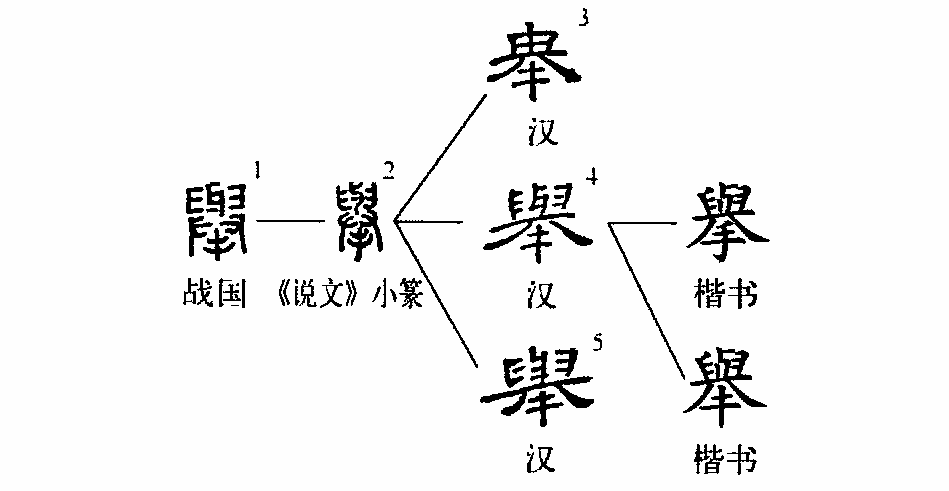 壺:“舉賢使能。”小篆從手,本作擧。清邵瑛《說文群經正字》:“今經典作舉。隸變漢碑多如此作,今俗因之。”可見,隸變以后,舉的下部由“手”變為“